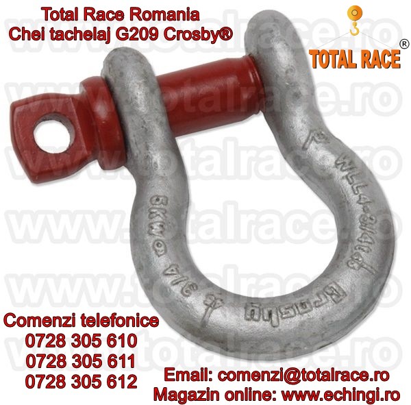 - Total Race ofera la vanzare : chei tachelaj model G 209 tip omega marca Crosby, cheie tachelaj cu bolt filetat , chei tachelaj capacitati intre 0.33 Tone si 55 Tone . Cheile de tachelaj sunt in conformitate cu: EN 13889:2003 , indeplinesc cerintele de performanta ale Fed. Spec. RR-C271D tip IVA, grad A, Clasa 2. Chei de tachelaj cu factor de siguranta: MBL = 6 x WLL (Sarcina maxima de lucru) , cheie tachelaj: Forjat- Calit si Temperat - Material otel aliat , galvanizata la cald . Capacitatea stantata permanent pe shackles. Cheile de tachelaj peste capacitate WLL= 25 Tone sunt echipate RFID.Cheile de tachelaj Crosby® se livreaza cu certificate de calitate CE de la producator. Pentru detalii accesati: www.echingi.ro & www.cheitachelaj.ro