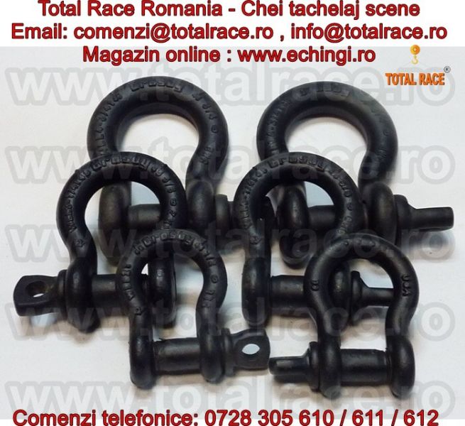 Total Race comercializeaza : chei de tachelaj pentru scena/ teatru / circ / concerte , chei de tachelaj model S 209T tip omega marca Crosby, cheie tachelaj cu bolt filetat . Chei de tachelaj cu capacitati intre 1 tona si 4,75 tone. Gambetii sunt in conformitate cu EN 13889 si indeplinesc cerintele de performanta ale Fed. Spec. RR-C271D tip IVA, grad A, Clasa 2, ASME B30.26. Cheile de tachelaj au factor de siguranta: MBL = 6 x WLL (Sarcina maxima de lucru) , shackles Forjat - Calit si Temperat, cu bolt aliat , material otel aliat , capacitatea stantata permanent.