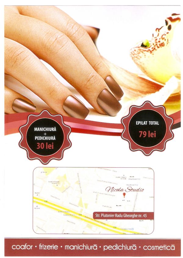 Va oferim coafor, manechiura, pedichiura, cosmetica la SALONUL “NICOLA BEAUTY STUDIO” – beauty and style – din str. RADU GHEORGHE nr. 45 Bucuresti sector 3.