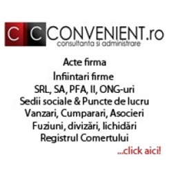 - Infiintare S.R.L., S.A., Filiala, Sucursala; PFA, II; ONG: Asociatii, Fundatii; Infiintare / Radiere Punct de lucru; Gazduire/Schimbare Sediu Social; Suspendare firma; Reactivare Firma; Revocare/numire Administrator; Cesiune de parti sociale; Majorari capital social; Asocieri/ Fuziuni/ Divizari/ Dizolvari/ Lichidari/Radieri Firme; Notificări, Concilieri, Somaţii, Ordonante de plata, Adrese, Cereri, Intampinari, Actiuni in justitie. Tel: 0720615062. www.convenient.ro