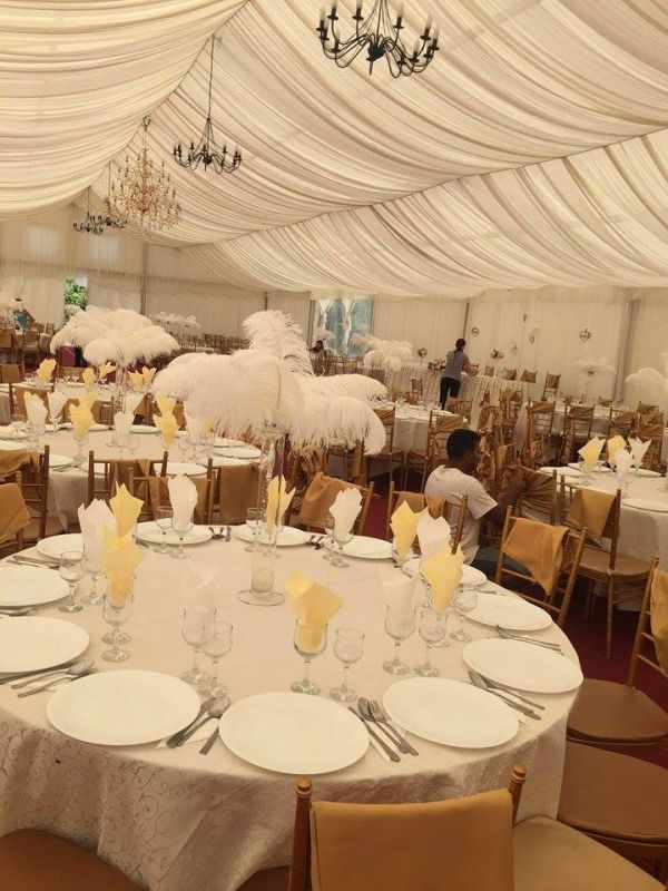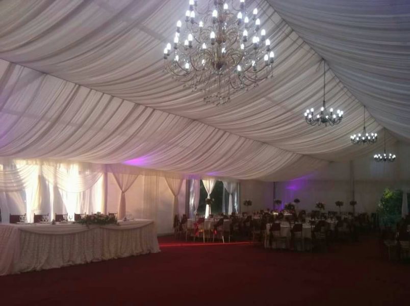 - podea, drapaj, scaune (plastic/Chiavari), mese, candelabre, vesela, lumini ambientale, mocheta, vaze, fete de masa, funde.
