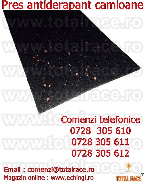 - Total Race Romania comercializeaza covor antiderapant pentru camioane , pres antiderapant tip rola pentru transport marfa , covorase antialunecare productie UTX® Olanda , covor antiderapant tip rola cu urmatoarele dimensiuni lungime 5 metri grosime 8 mm , latime 250 mm, pres antialunecare tip rola cu urmatoarele dimensiuni lungime 5 metri grosime 4 mm , latime 150 mm , covorase antialunecare utilizate pentru transport marfa, covorase antiderapante pentru camioane, covorase antialunecare destinate tranportului de marfa. Presul antiderapant se aseaza intre marfa si podea pentru o mai buna stabilitate a marfurilor pe timpul transportului ( rutier, feroviar, maritim ) si au rezistenta la frecare foarte mare.