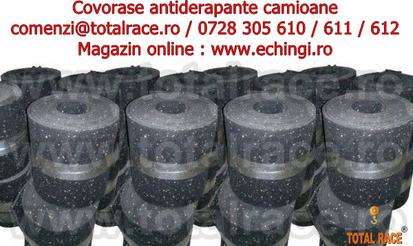 Total Race Romania comercializeaza covor antiderapant pentru camioane , pres antiderapant tip rola pentru transport marfa , covorase antialunecare productie UTX® Olanda , covor antiderapant tip rola cu urmatoarele dimensiuni lungime 5 metri grosime 8 mm , latime 250 mm, pres antialunecare tip rola cu urmatoarele dimensiuni lungime 5 metri grosime 4 mm , latime 150 mm , covorase antialunecare utilizate pentru transport marfa, covorase antiderapante pentru camioane, covorase antialunecare destinate tranportului de marfa. Presul antiderapant se aseaza intre marfa si podea pentru o mai buna stabilitate a marfurilor pe timpul transportului ( rutier, feroviar, maritim ) si au rezistenta la frecare foarte mare.