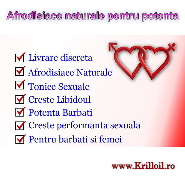 - Va oferim afrodisiace naturale pentru a creste potenta, libidoul si placerea atat la femei cat si la barbati: Iarba Tapului (Iarba Caprei Nebune) (Epimedium grandiflorum), Muira Puama, Maca (Lepidium meyenii), Mucuna Pruriens (L-Dopa), Yohimbe, Tongkat ALI, Ginseng rosu, Rhodiola, Tribulus, Arginina. Produse naturale ce cresc energia, rezistenta si ofera o mai buna concentrare. www.Krilloil.ro