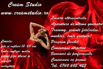 - Viziteaza-ne si fa-ti o idee despre conceptele care ne definesc: respect, seriozitate, corectitudine si eleganta in desfasurarea activitatii. Organizam interviuri pentru angajare modele videochat, fete si cupluri cu varsta peste 18 ani. Cerinte: limba engleza-nivel mediu, operare pc-nivel mediu, aspect fizic placut. Oferim studio modern situat central, training, sedinte foto/video. Comisioane intre 50 si 80%, bonusuri si premii cu plata bilunar. Tel. 0764643423, www.creamstudio.ro, https://www.facebook.com/creammodelstudio.