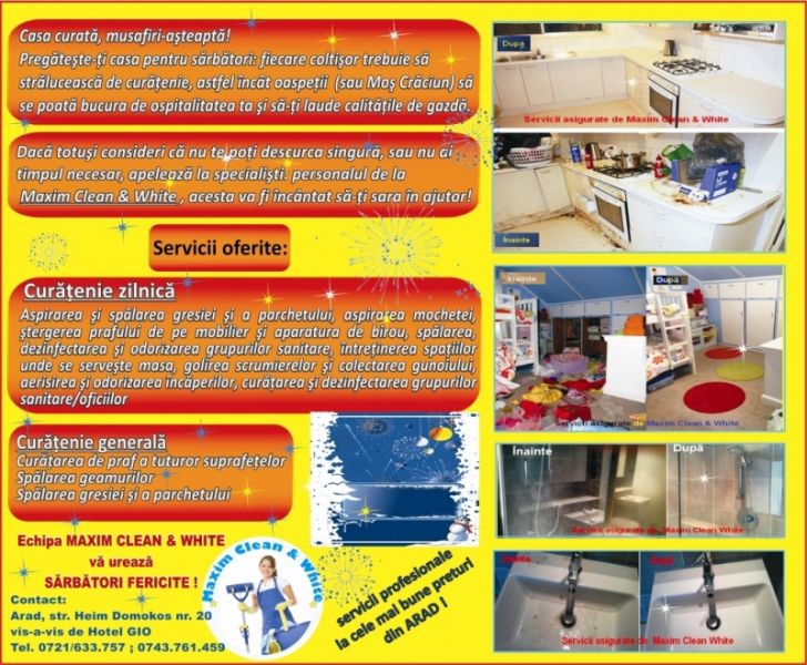 Motoul nostru : “Curatenie la Maxim” Contact tel. 0734608709 ; 0743761459 e-mail: maximclean@yahoo.com Adresa: Arad, str. Heim Domokos, nr.20 - Raspunde la: maximclean@yahoo.com