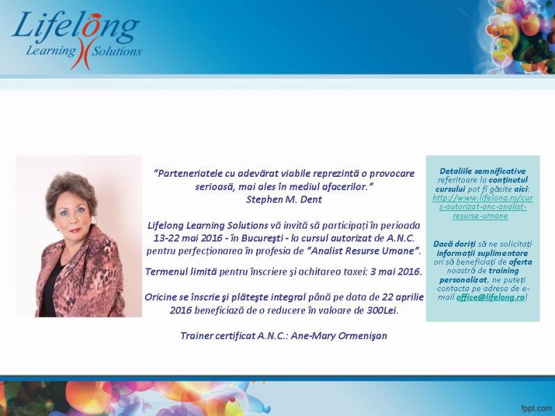 Lifelong Learning Solutions va invita sa participati intre 13-22 mai 2016 la cursul Analist Resurse Umane - Cod C.O.R. 333306, acreditat A.N.C.