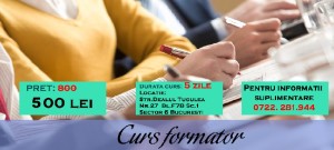 - Cursurile de formator sunt autorizate, de Ministerul Muncii, iar la finalul cursului primiti un certificat de calificare care sa ateste abilitatile profesionale dobandite. La finalul cursului acreditat de Formator, absolven?ii, datorita certificatului obtinut in urma absolvirii,vvor putea utiliza metode si tehnici in educatia adultilor, metode de proiectare, organizare si evaluare a programelor de formare. Vor sti sa identifice necesitatile de instruire, sa foloseasca limbajul verbal, limbajul nonverbal si paraverbal în favoarea lor; capacitatea de a aplica teoriile instruirii diferentiate, intelegerea si aplicarea principiilor invatarii active. Durata cursului de calificare formator: 5 zile, 6 ore zilnic cu pauza de masa, ceai, cafea Locatie: Str.Dealu Tugulea Nr.27 Bl.F7B Sc.1 Sector 6, Bucuresti. 0724395645
