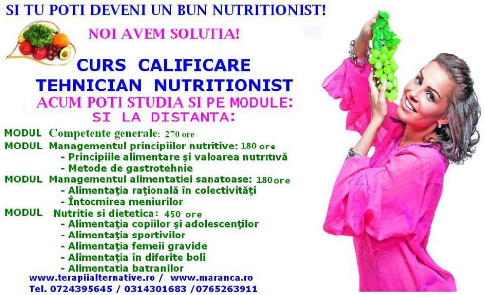 - Curs calificare Tehnician nutritionist 1080 ore din 15 mai 2014. Cursul se adreseaza tuturor persoanelor, din toate categoriile de varsta, care vor sa initieze o schimbare majora in viata si starea lor de sanatate. Acesta cuprinde urmatoarele competente:- Principiile alimentare si valoarea nutritiva - Metode de gastrotehnie - Alimentatia copiilor si adolescentilor - Alimentatia sportivilor - Alimentatia femeii gravide - Alimentat,ia batrānilor - Alimentatia rationala īn colectivitati - Alimentat,ia īn diferite boli - Intocmirea meniurilor. Cursurile se vor tine in wekend (sambata si duminica) sau in cursul saptamanii in functie de solicitarile si posibilitatile dvs. Locuri limitate 20. Se pun la dispozitie suport de curs pentru fiecare competenta. Examinarea consta in proba teoretica (test grila) si Proba practica (sustinerea unui proiect). PROMOTIE in loc de Pret curs 2400 lei platiti 1500 lei pana la 15.05.2014 Acte inscriere copie CI, certificat de nastere, act studii Liceu. MAR ANCA COMPANY BUCURESTI