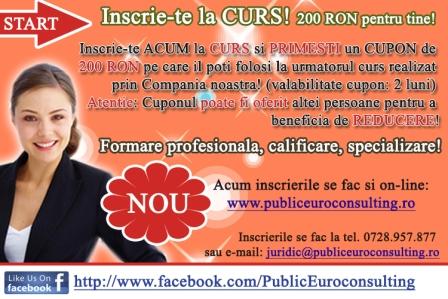 ANC; se elibereaza diploma recunoscuta de Ministerul Muncii si Ministerul Educatiei. Pret: 500 RO; Fiecare cursant primeste 1 CUPON - 200 RON REDUCERE, valabil 2 luni pentru un alt curs realizat prin compania noastra! Acest CUPON poate fi oferit altei pers!