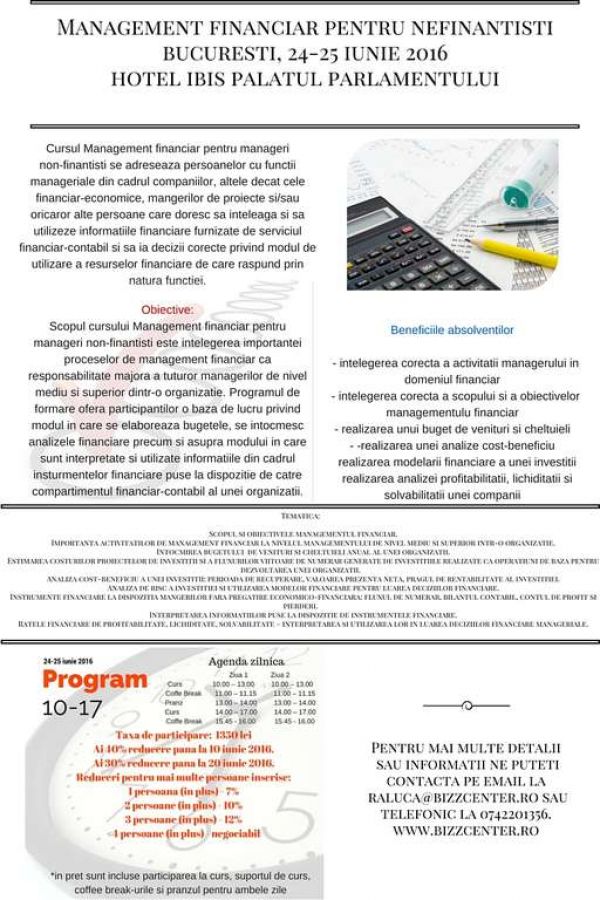 - Cursul Management financiar pentru manageri nonfinantisti se adreseaza persoanelor cu functii manageriale din cadrul companiilor, altele decat cele financiare-conomice, mangerilor de proiecte si/sau oricaror alte persoane care doresc sa inteleaga si sa utilizeze informatiile financiare furnizate de serviciul financiar-contabil si sa ia decizii corecte privind modul de utilizare a resurselor financiare de care raspund prin natura functiei. Obiective: Scopul cursului Management financiar pentru manageri nonfinantisti este intelegerea importantei proceselor de management financiar ca responsabilitate majora a tuturor managerilor de nivel mediu si superior dintr-o organizatie. Pret: 650 RON. Email: raluca@bizzcenter.ro .Website: www.bizzcenter.ro