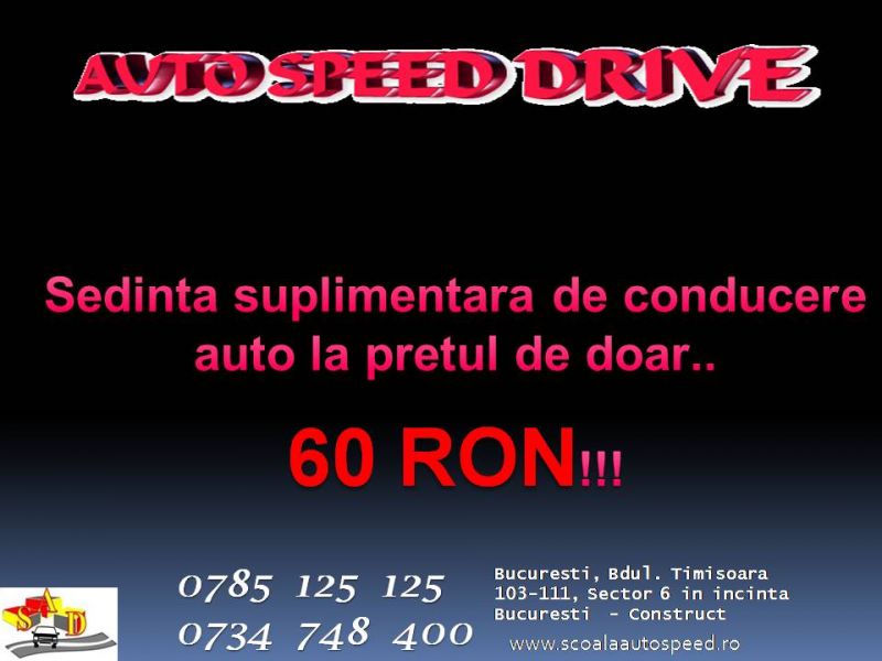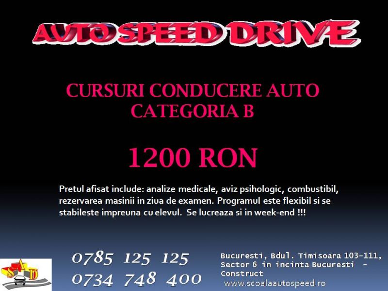Scoala de soferi de la 1200 RON (include tarif curs conducere, analize medicale, examen psihologic, rezervare auto in ziua de examen) . Zone de acoperire Bucuresti - Ilfov. Programari si inscrieri la Tel: 0785.125.125 p.s. - Ne facem timp ptr toti elevii.