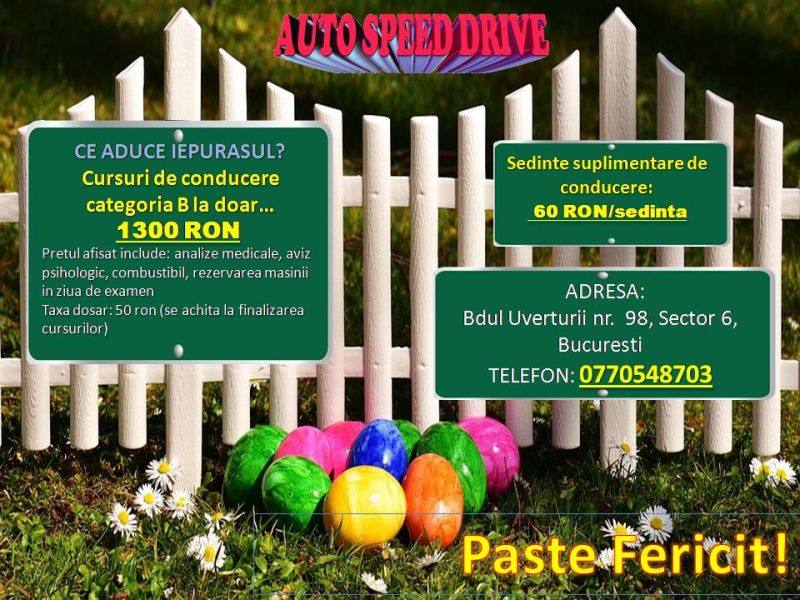 - AUTO SPEED DRIVE a vorbit cu iepurasul si au hotarat sa iti ofere cursuri de conducere categoria B la doar.. 1300 RON, care include analizele medicale, aviz psihologic, combustibil, rezervarea masinii in ziua de examen. Vrei sa devii un sofer priceput? Apeleaza la noi!