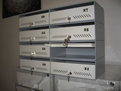 Cutii Poştale individuale (mari şi mici), Avizier pentru Asociaţiile de Proprietari/Locatari. Acestea sunt realizate din tablă TDA 0,7 mm vopsite în culoare gri-argintiu (imitaţie lovitură de ciocan), uşa cutiei este dotată cu broască tip "Yalle" cu 2 chei.