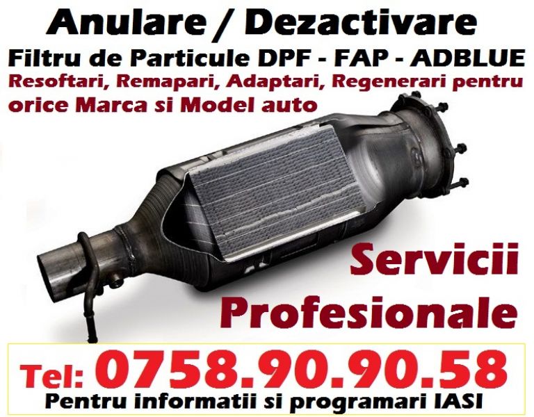 - Anulam / Dezactivam / Eliminam FILTRUL de PARTICULE D.P.F. - F.A.P la Orice MARCA si MODEL AUTO !!! Inclusiv modelele care nu au rezolvare pe teritoriul tarii. Tel: O758.9O.9O.58 - Folosim doar echipamente de ultima generatie. SUPER OFERTA! Anulare, Dezactivare Filtru de Particule DPF - FAP – ADBLUE - SCR cu preturi incepand de la 100 EURO ! Resoftam orice marca si model auto! Inclusiv 2017 ! Tel: 0767.877.777 . Pentru orice informatie sau programare va rugam sa ne contactati la nr. de Tel: O758.9O.9O.58 . Calitate garantata! - Anulare / Dezactivare Filtru de particule DPF - FAP - ADBlue - SCR , EGR, Sonda Lambda, Limitatoare de viteza, Remapari auto, Chip-Tuning. Tel: O758.9O.9O.58 sau 0767.877.777 - Service Autorizat