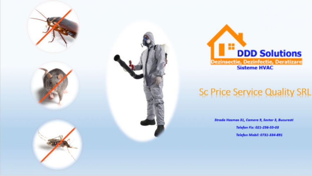 Oferim servicii D.D.D. - Dezinsecție, Dezinfecție si Deratizare pentru domicilii, Asociații de proprietari cāt și pentru Companii. Oferim servicii profesionale de īnaltă performanță īn domeniul DDD, folosind substanțe și echipamente profesionale. Echipa noastra este calificată și atestată de către Direcția de Sănătate Publică. Executăm operațiuni de distrugere a insectelor zburătoare și tārātoare (tantari, gandaci, plosnite, capuse, viespii, etc.), cāt și a rozătoarelor (șobolani, șoareci) īn spatii deschise, (terase, curți), cāt și īn spații īnchise de orice tip, (restaurante, birouri, spații de locuit, depozite, -