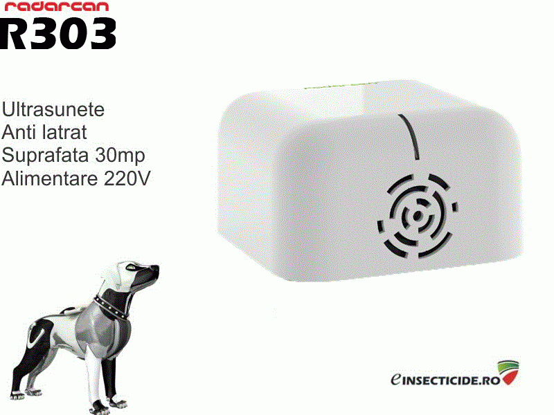 - Radarcan R303 este un dispozitiv anti latrat pe baza de ultrasunete, creat pentru a evita latratul cainelui . Comenzi la numarul de telefon :0758101503 sau http://www.einsecticide.ro/produse~anti-caini-pisici~anti-latrat~63~295