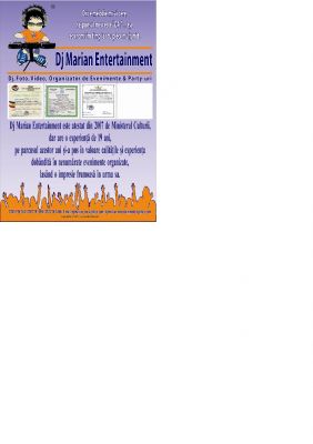 - Dj Nunta, Dj Botez, Dj Cununie Civila, Dj Party-uri, Dj Zi Onomastica, Dj Petrecere Copii, Dj Revelion, Dj Corporate. Dj cu experienta care poate asigura o gama larga de genuri muzicale si un echipament profesional de dj, atestat de Ministerul Culturii si autorizat, cu o experienta de peste 20 ani cu un portofoliu de clienti foarte larg. Valoarea prestatiei incepe de la 500,00 lei, in functie de solicitarea si alocarea echipamentul necesar pentru evenimentul mentionat. Pentru mai multe informatii puteti apela la numerele de telefon: 0744129328; 0760303902; 0727656511