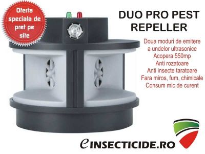- Duo pro pestrepeller aparat cu ultrasunete impotriva rozatoarelor si gandacilor de bucatarie. Doua moduri de emitere a ultrasunetelor. Acopera 550mp la un unghi de 270 grade. Fara chimicale, ecologic, non toxic. Livram in toata tara. Info pe www.einsecticide.ro Pret: 142.99