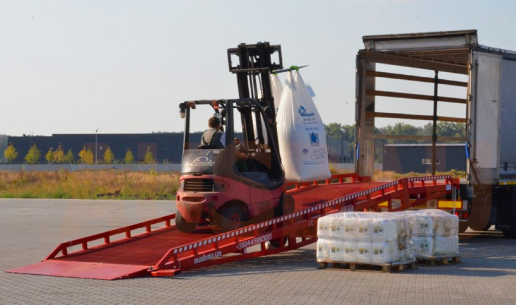 Īncărcătorul ridică marginea rampei (există un loc special pentru prinderea cuplajului rigid) și īl aduce la camion. Cu ajutorul pompei hidraulice, o persoană, apăsānd mānerul pompei hidraulice, stabilește īnălțimea rampei la nivelul cerut (de la 900 mm pīnă la 1650 mm). Īn complect cu platformă mobilă merge frāne de oprire și lanțuri. -