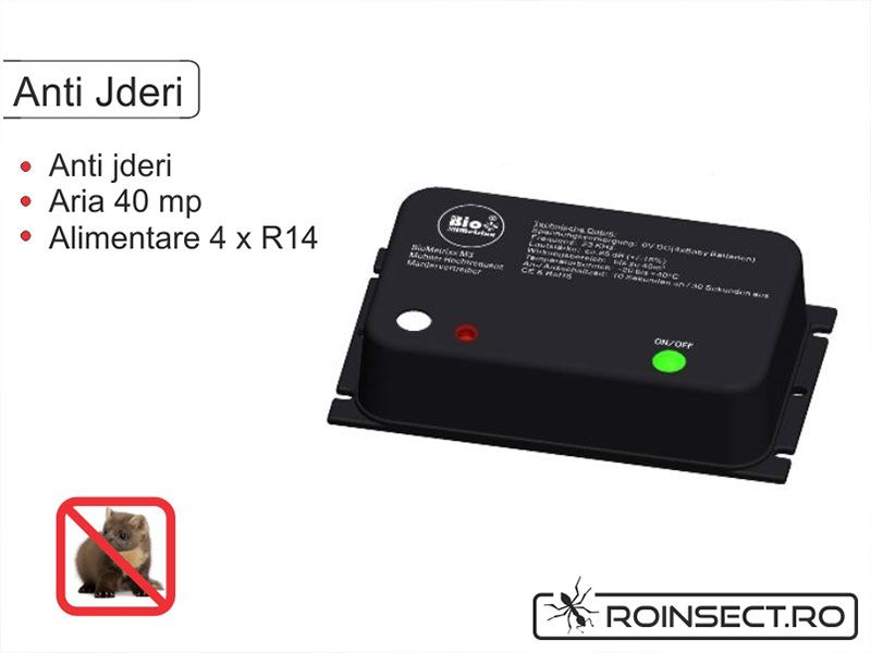 Aparatul Biometrixx M3 este un aparat ce cu ajutorul ultrasunetelor alunga jderii,soarecii ,dihorii si nu necesita alimentare la priza ,poate fii folosit in aer liber. Comenzi la numarul de telefon :0758101503 sau http://www.roinsect.ro/pesticid/aparat-ultrasunete-anti-jder-anti-soareci-sobolani-biometrixx-m3-40-mp-/660