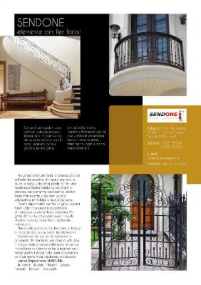 Sendone vine in intampinarea clientilor sai cu o gama completa de elemente din fier forjat cum ar fi: c-uri din fier forjat , s-uri din fier forjat, bulbi din fier forjat, rozete din fier forjat profile amprentate din fier forjat si canelate, varfuri din fier forjat, ornamente din fier forjat, flori si frunze din fier forjat,montanti drepti si curbati din fier forjat,teava amprentata,silduri si manere,balamale,diverse terminatii din fier forjat,platbanda amprentata si mana curenta din fier forjat diverse modele.