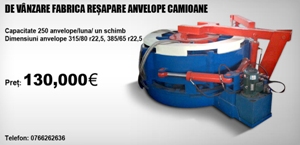 - Vand sau schimb fabrica de resapat anvelope camioane, an fabricatie 2010 functionala, dimensiuni 315/80 R 22,5 si 385/65 R22,5 cu auto sau camioane + diferenta. Pret 130000 Euro. Tel. 0766262636, 0784281282