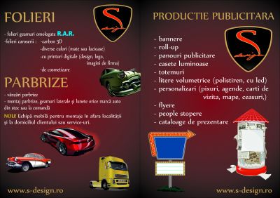 S Design Automotive este o companie din Iași, specializată în folierea geamurilor autovehiculelor și clădirilor, colării de autovehicule, aplicarea de autocoloante și înscripționări. Combinând cererea consumatorilor, cu tehnologia inovatoare, oferta S Design oferă mașinii tale un aspect elegant și în același timp o mai mare durabilitate geamurilor autovehicului dumneavoastră.