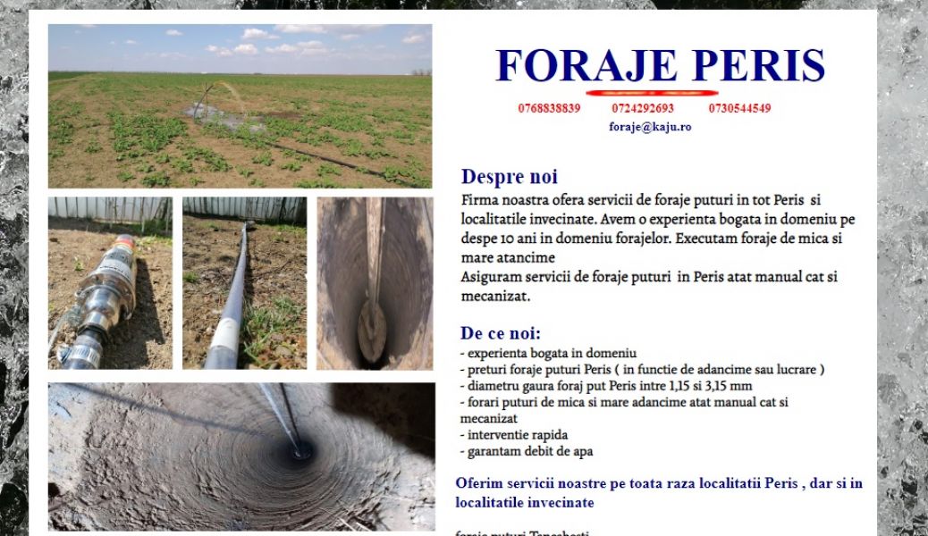 - Firma noastra, cu o experienta de peste 10 ani in domemiul forajelor actioneaza in Peris si in localitatile vecine cu servicii de foraje puturi de apa de mica si mare adancime. Garantam servicii de calitate la preturi bune. Asiguram foraje atat prin foraje manuala cat si prin sistem mecanizat.