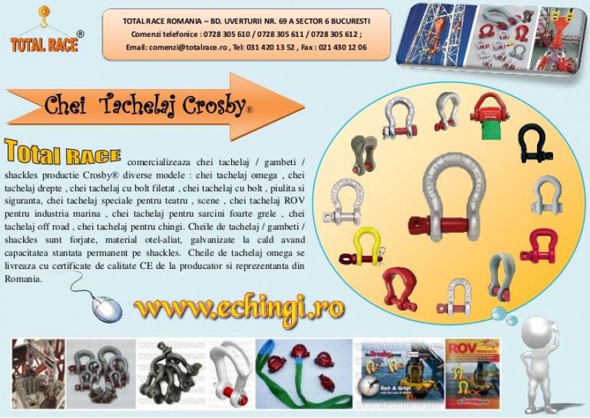 Total Race comercializeaza chei tachelaj / gambeti / shackles productie Crosby® , diverse modele : chei tachelaj omega , chei tachelaj drepte , gambeti cu bolt filetat , gambeti cu bolt , piulita si siguranta, chei tachelaj speciale pentru teatru , scene , shackles ROV pentru industria marina , gambeti pentru sarcini foarte grele , chei tachelaj off road. Cheile de tachelaj / gambeti / shackles sunt forjate, material otel-aliat, galvanizate la cald avand capacitatea stantata permanent pe shackles.