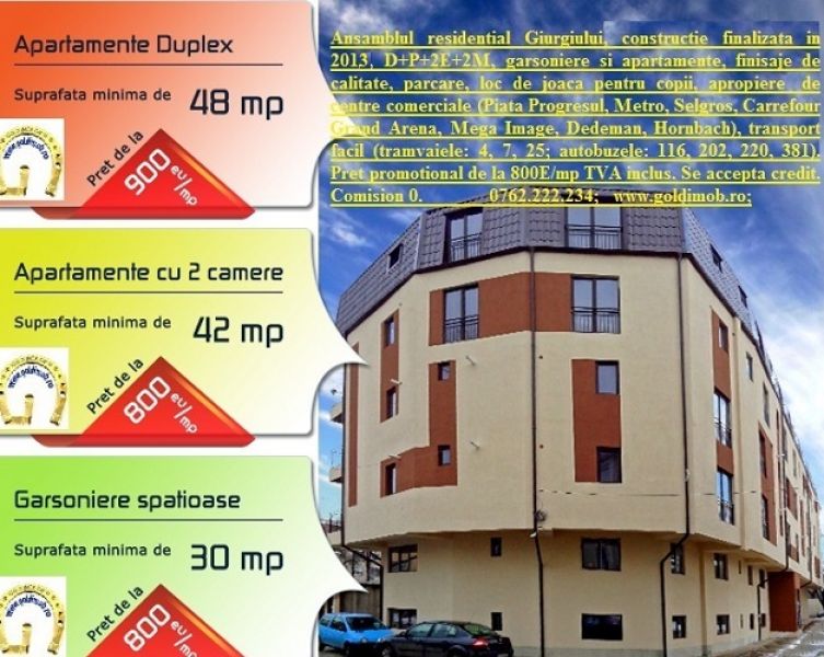 - Ansamblul residential Giurgiului, constructie finalizata in 2013 si locuita in aproximativ jumatate din apartamente, structurata: D+P+2E+2M, garsoniere si apartamente, finisaje de calitate, parcare, loc de joaca pentru copii, apropiere de centre comerciale (Piata Progresul, Metro, Selgros, Carrefour Grand Arena, Mega Image, Dedeman, Hornbach), transport facil (tramvaiele 4,7, 25; autobuzele: 116, 202, 220, 381). Pret promotional de la 800E/mp TVA inclus. Se accepta credit. Comision 0. 0762222234