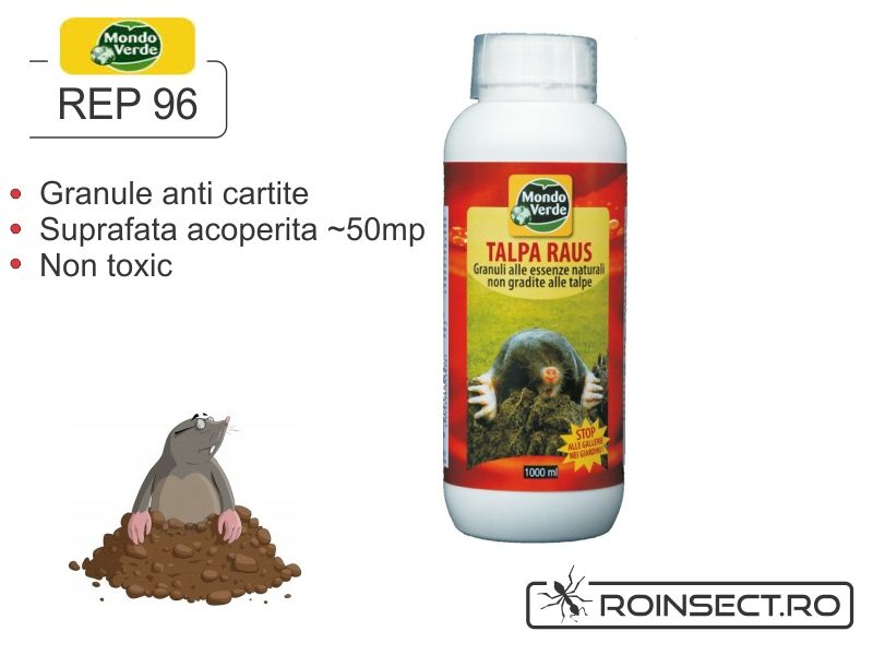 - Granulele parfumate REP 96 sunt granule ce creeaza o bariera olfactiva deranjanta in locurile unde sunt aplicate si tin cartitele ,soarecii de camp si aricii la distanta ,datorita esentelor naturale cu care sunt imprecnate. Comenzi la numarul de telefon :0758101503 sau http://www.anticartite.ro/produs/granule-ecologice-anti-cartite-soareci-de-camp-popandai-si-arici-rep-96/9
