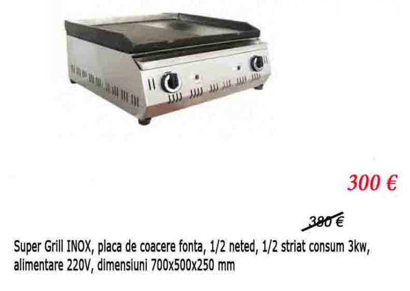 - Super Grill INOX, placa de coacere fonta, 1/2 neted, 1/2 striat Putere 3kw, Alim. 220V/50Hz, Dimensiuni (700x500x250) mm; Vezi Cod Site R89; Pret 300 Euro +TVA; 0721 922 902 / 0732 702 331 / 0720 852 570; Depozit- Soseaua Alexandriei nr 308; http://www.horeca-bucuresti.ro/produs.php?id=801