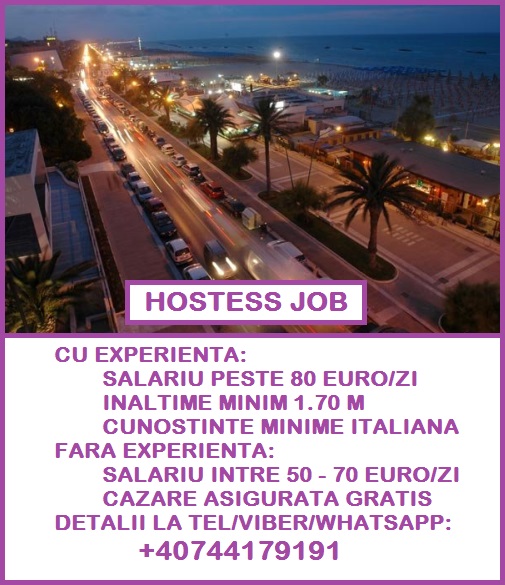 - Cluburi cautam hostesse cu experienta, salariu peste 80 Euro plata zilnic, inaltimea de minim 1.70 m, intre 50 si 70 euro plata zilnic pentru hostesse fara experienta; Castig lunar in jur de 3500 Euro, cazare asigurata. Tel/ Viber, Whatsapp: +40 744179191, Messenger: anuntnewstyle, Facebook: anunt.newstyle sau puteti trimite pe e-mail: anuntnewstyle@yahoo.com nume, data nasterii, inaltime, cateva poze si va contactam noi imediat.