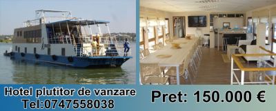- Vand Hotelul plutitor in Dunarii, Tulcea.Hotelul este compus din: 8 camere duble intime si primitoare, dotate cu grup sanitar propriu, sistem centralizat de incalzire si aer conditionat, aparate si plasa antitantari, restaurant - elegant si cochet cu o capacitate de 24 de locuri, Sala este pretabila organizarilor de evenimente, conferinte si traininguri fiind dotata de sistem audio video (TV satelit, DVD, videoproiector si plasma)bar - puteti servi bauturile dumneavoastra preferate, degusta faimoasa âtuicaâdin productia proprie sau va puteti desfata cu buchetul celor mai renumite vinuri romanesti, terasa acorperita dotata de confortabila mobila outdoor va permite sa va relaxati, sa admirati mirifica priveliste ce va inconjoara, sa va savurati ceaiul de dupa-amiaza sau sa faceti fotografii, Terasa cu sezlonguri pentru relaxare la soare sau pur si simplu pentru a admira intr-un mod unic peisajele deltei.Pret: 150 mii euro.