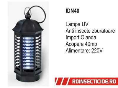 - IDN40 lampa UV anti insecte tantari muste. Actioneaza fara lichide, sprayuri, mirosuri, substante toxice. Fara reserve sau consumabile. Lumina ultravioleta emisa de neonul UV atrage insectele, iar grilajul electric le electrocuteaza. Livrari in toata tara. Info .roinsecticide.ro / 0758101503 Pret: 49.99