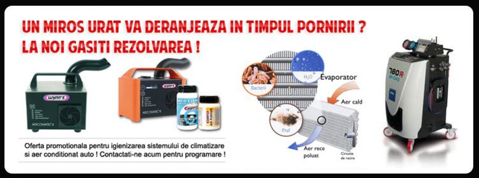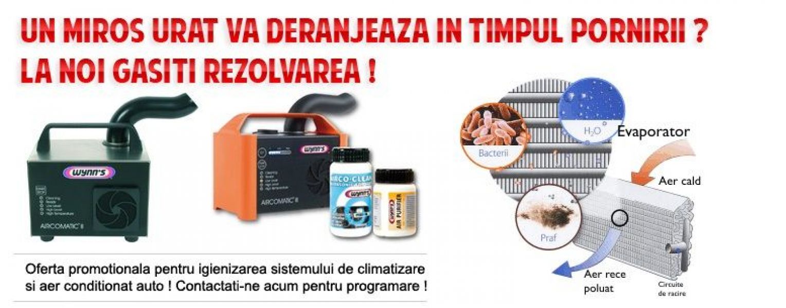 - Serviciul de igienizare Wynn's Aircomatic III prin tehnologia ultrasunetelor va scapa de mirosurile urate provenite din sistemul de climatizate a masinii precum si cele de pe suprafetele interiorului masinii cum ar fi mirosul de tigara, mirosul lasat de alimente ratacite prin masina, mirosul provenit de la umezeala adusa pe incaltaminte impregnata in presuri, etc. Reimprospateaza-ti interiorul masinii ! Transforma-l din nou intr-un mediu sanatos si comfortabil ! Ai schimbat filtrul de polen dar mirosul nu a disparut, ce e de facut, de unde provine acest miros ? Locul intunecos si racoros din instalatia de climatizare a masinii este un adevarat paradis pentru dezvoltarea microorganismelor cum ar fi mucegai, acarieni, fungii. Pret: 150 Ron. Email: office@garajulauto.ro Website: www.igienizareauto.com