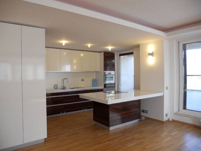 - Inchiriere duplex 5 camere, cu o suprafata de 260 mp, situat pe etajele 6 si 7 ale unui imobilul cu 8 etaje, construit in anul 2010. Parterul cuprinde un living cu dining si bucatarie open-space (bucataria este mobilata si utilata modern) avand o suprafata de aproximativ 60 mp, un grup sanitar, hol si doua dressinguri. Accesul catre terasa de peste 60 mp se face atat din living prin usi culisante duble cat si prin bucatarie. Etajul este compartimentat in trei dormitoare, doua bai, hol si dressing. Dormitorul matrimonial are baie proprie si acces catre un balcon spatios. Celelalte dormitoare sunt deservite de o baie foarte spatioasa dotata cu cada pe colt si au fiecare iesire catre balconul propriu. Finisajele interioare sunt de foarte buna calitate (bai imbracate in marmura, obiecte sanitare Vitra, baterii Grohe, tamplarie termopan, parchet stratificat Tarkett, corpuri de iluminat moderne, scara interioara imbracata in lemn). Dormitoarele sunt dotate cu aparate de aer conditionat