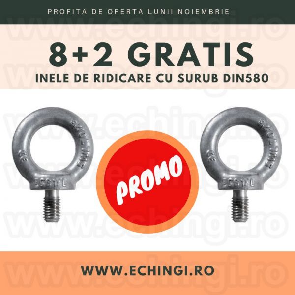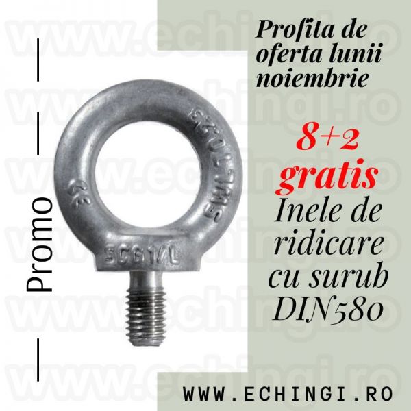 Total Race Romania comercializeaza din stoc Bucuresti inele de ridicare cu surub ( inele de ridicare tip tata) DIN 580. OFERTA SPECIALA: la achizitia a 8 inele beneficiati de 2 gratis! Profita de oferta si comanda acum: inele de ridicare cu filet exterior DIN 580, ocheti de ridicare cu surub DIN 580, surub cu ureche DIN 580 – APS2 , inel cu surub DIN 580 , inel de ridicare din otel zincat pentru deplasarea greutatilor DIN580 , ochet insurubabil DIN 580 , inele ridicare insurubabile DIN 580. Material otel slab aliat.