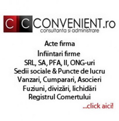 Servicii juridice, administrative pentru societatile comerciale! infiintari firme, infiintare s.r.l., s.a.; infiintare persoana fizica autorizata, intreprindere individuala, intreprindere familiala; infiintare filiala, sucursala. infiintare punct de lucru; radiere punct de lucru; autorizari; prelungire valabilitate sediu/punct de lucru; dizolvare, lichidare, radiere firma; gazduire sedii sociale; schimbare sediu social firma; revocare/numire administrator; excludere/cooptare asociati; majorari capital social; asocieri; cedari; vanzari - cumparari firme; cooptare/ retragere asociati; cesiune de parti sociale; suspendare activitate firma; reluarea activitatii firmei; recodificari cod caen rev2; completarea, schimbarea, autorizarea obiectului de activitate; rezervare, schimbare denumire societate; certificate constatatoare; inregistrare, autorizare reprezentante; fuziuni ale societatilor comerciale;