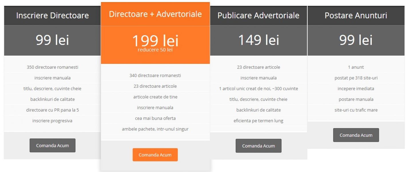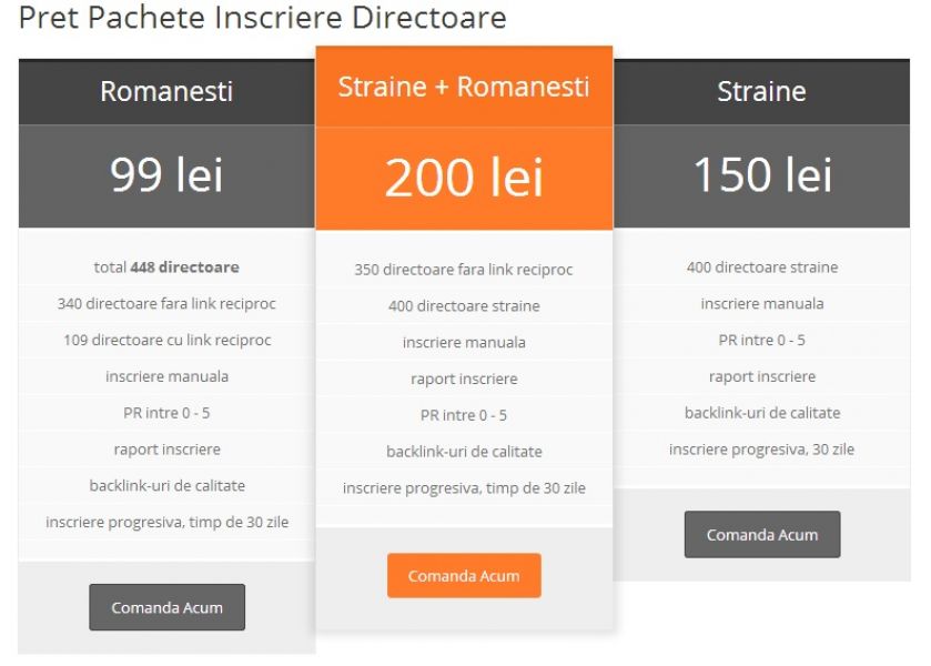 Pentru o mai buna pozitionare in Google inscriem site-ul tau in 340 de directoare in decursul a 30 de zile. Oferim facture si raport de inscriere. Inscrierea se face manual de catre operatori umani. Pret 99 ron, plata se face prin transfer bancar sau direct in sediul din Bucuresti. Pentru mai multe detalii contactati-ne!