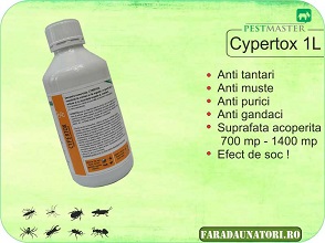 - Cypertox 1L 50ml - insecticid universal impotriva unui spectru larg de insecte: gandaci, plosnite, purici, muste, tantari, molii, capuse, termite, acarieni, paianjeni, termite, furnici, etc. La concentratiile recomandate de utilizare , produsul nu este fitotoxic, are toxicitatea redusa pentru operator , animal si mediu.