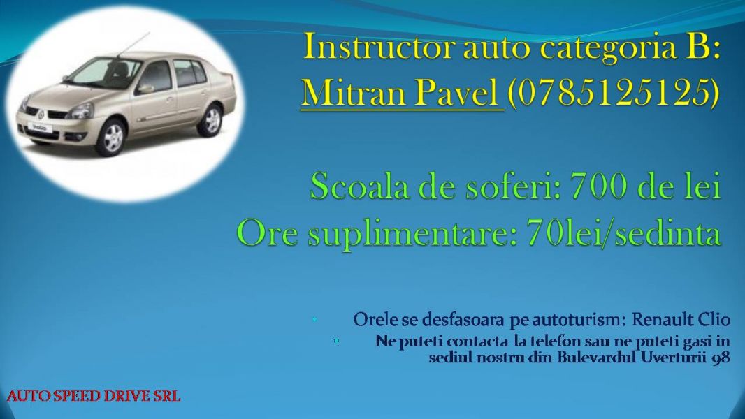 Curs scoala de soferi cu instructor auto autorizat, cat. B(Mitran Pavel) ofer lectii de condus pe autoturism Renault Clio-700 de lei, avand program flexibil si disponibilitatea de a lucrasi in week-end!!!