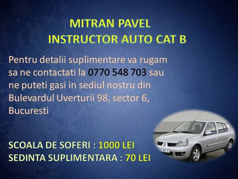 Curs scoala de soferi cu instructor auto autorizat, cat. B Sector 5 Mitran Pavel ofer lectii de condus pe autoturism Renault Clio-1000 de lei, avand program flexibil si disponibilitatea de a lucra si in week-end!!! Incepere imediata a cursului!!!