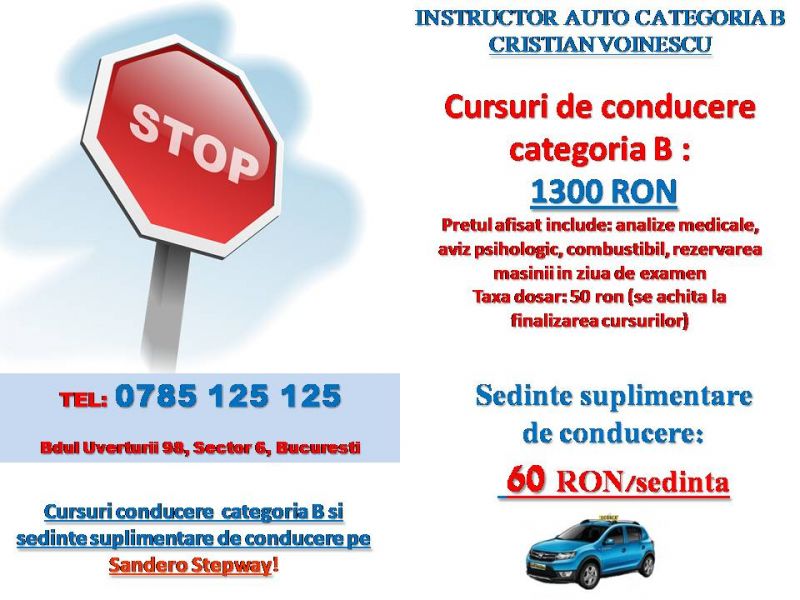 Ma numesc Cristian Voinescu si sunt Instructor auto categoria B, autorizat, din Bucuresti. Imi ofer serviciile necesare pentru obtinerea permisului auto cat B la pretul de doar 1300 ron (totul inclus). Orele se efectueaza pe Sandero Stepway. Lucrez si in week-end !!! *