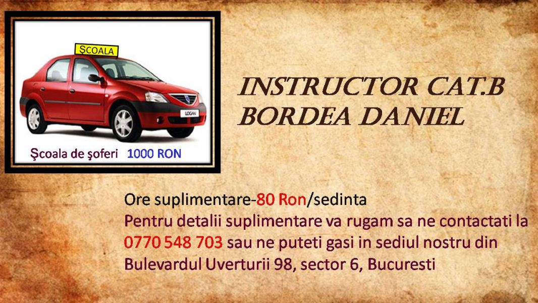 - Curs scoala de şoferi cu instructor auto autorizat, cat. B BORDEA DANIEL ofer lecţii de condus pe autoturism Dacia Logan –Benzina avand program flexibil si disponibilitatea de a lucra si in week-end!!! Pentru informatii suplimentare sunati la nr de telefon 0785.125.125.Se fac inscrieri si din localitatile: Chiajna,Domnesti,Ciorogarla,Bolentin,Cosoba, Rosu si din împrejurimi.Ȋncepere imediata a cursului !!!