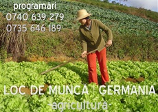 - Iti oferim sansa de a munci in conditii deosebit de avantajoase in agricultura,sere ,hale in Germania impreuna cu sotia(sotul),grupuri etc.Salarii si condtii de cazare deosebite si transport asigurat de firma noastra.Pentru inscrieri si informatii contactati-ne de luni pana vineri la nr de telefon 0735646189 si 0740639279 .TEODORA.www.muncagermaniaaustria.ro