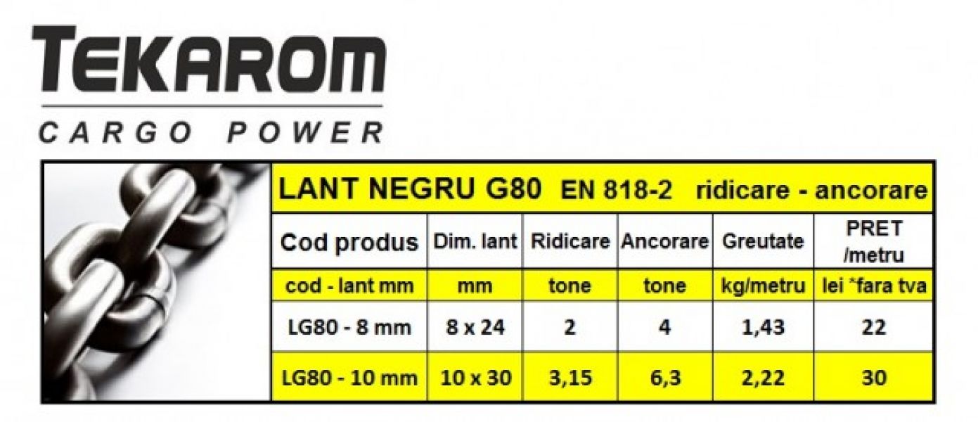 Puteti selectiona in tabelul de mai sus lungime lant (1-8 metri). Pentru lungimi mai mari va rugam sa ne contactati. Pretul este exprimat pentru metru liniar. Se poate taia la orice lungime.