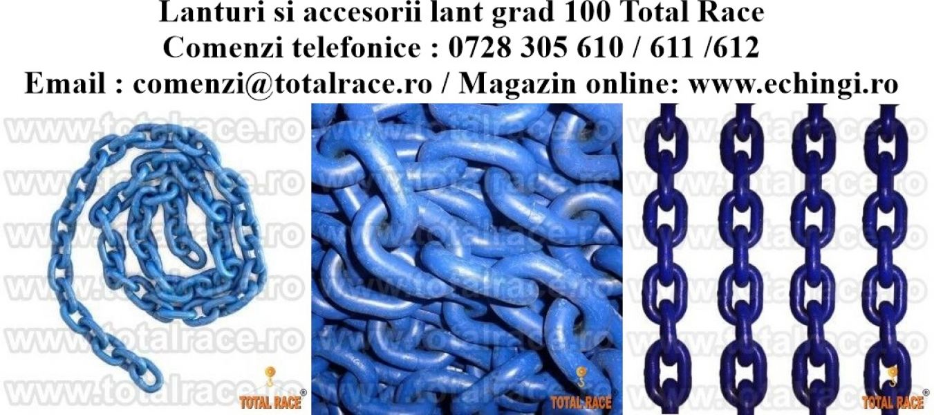 Total Race Romania comercializeaza cu livrare din stoc carlige clevis cu siguranta grad 100 , carlige clevis cu autoblocare grad 100, carlige cu ochi , autoblocare si maner grad 100 , carlig cu ochi si autoblocare grad 100 , carlige scurtare pentru lant grad 100 , scurtatoare de lant clevis tip cleste , lanturi de ridicare grad 100 , lant industrial vopsit albastru , cuple de legatura pentru lant grad 100 , dispozitive de ridicare din lant grad 100 cu 1 brat , dispozitiv de lant grad 100 cu 2 brate , sistem de ridicare cu 3 brate lant grad 100 , instalatie de ridicare cu 4 brate din lant industrial vopsit albastru grad 100 , accesorii lant grad 100 , lant ridicare 8 mm 2.5 tone, lant albastru 10 mm capcitate de ridicare 4 tone , lant albastru za 13 mm WLL 6.7 tone , lant industrial dimensiune za 16 mm capacitate 10 tone, inel principal simplu grad 100 pentru dispozitive lant cu 1-2 brate , inel principal dublu pentru dispozitive lant grad 100 cu 3-4 brate. Lanturile si accesoriile -