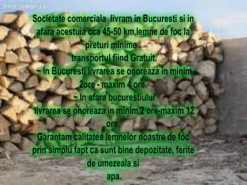 - Societate comerciala va ofera spre vanzare lemne de foc de esenta tare fag, stejar, carpen, numai calitate superioara, in depozitul nostru lemnele sunt foarte bine depozitate ferite de umezeala, lemnele se vand la metru ster sau tona taiate la dimensiunea de care aveti nevoie, emitem deasemenea factura, bon fiscal si aviz de insotire a marfii, va invitam in depozitul nostru din sos Bucuresti - Magurele nr 45a pentru a ne cunoaste, a vedea calitatea lemnelor si de asemenea puteti asista si la cantar. Prin calitatea serviciilor si a marfii noastre dorim sa multumim clientii nostrii, sunati-ne nu aveti nimic de pierdut, doar de castigat cu siguranta: lemne de calitate superioara si o buna colaborare. Pret: 200 Ron. Email: ana_steff@yahoo.com Website: http://anastefflemnedefoc.weebly.com/